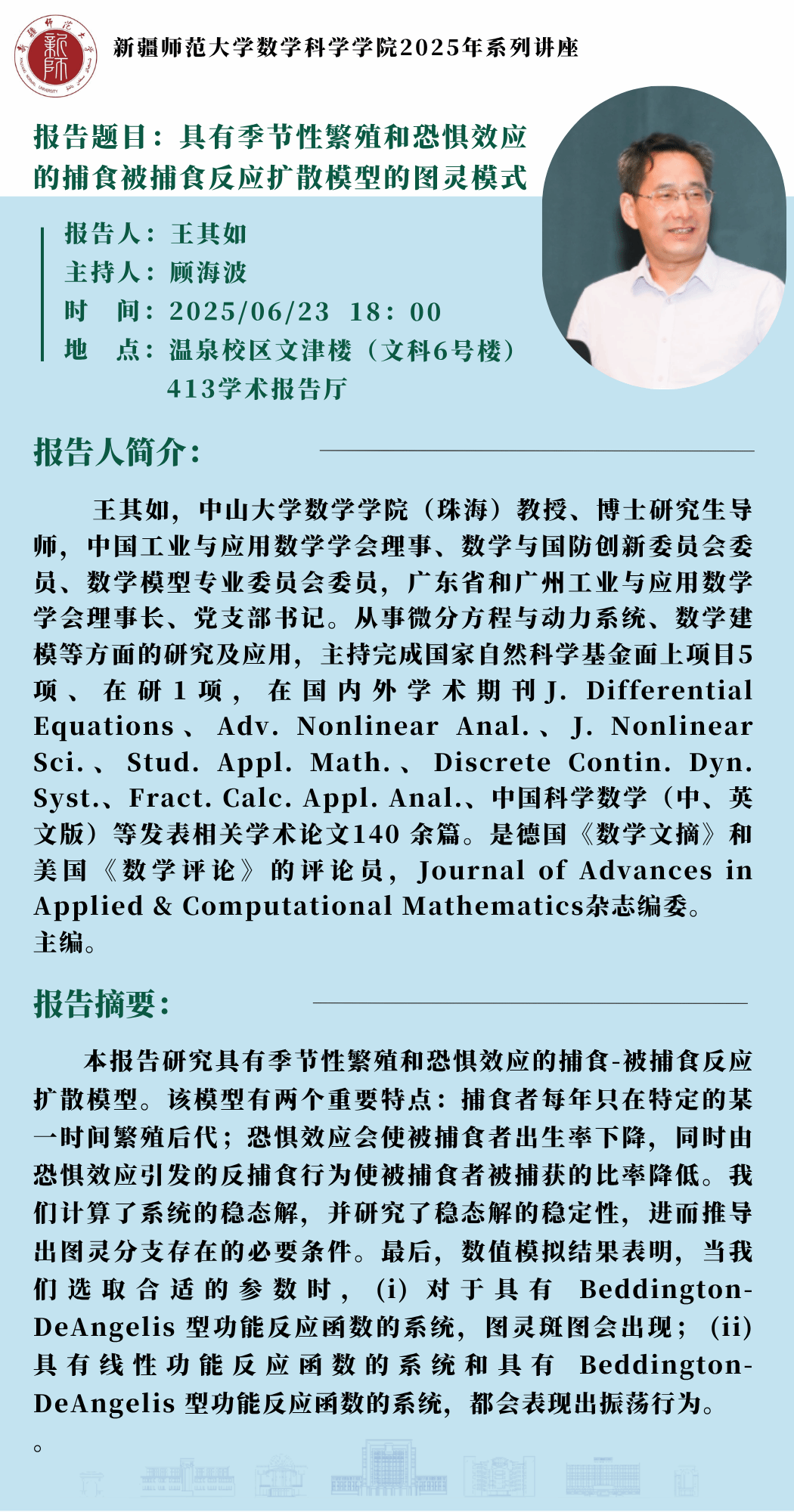 2025系列学术讲座预告:具有季节性繁殖和恐惧效应的捕食被捕食反应扩散模型的图灵模式