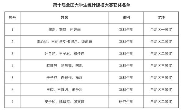 近日,第十届全国大学生统计建模大赛公布结果,最终我校本科生获新疆赛区一等奖1项,二等奖2项,三等奖3项;研究生获新疆赛区二等奖1项,实现了新突破。